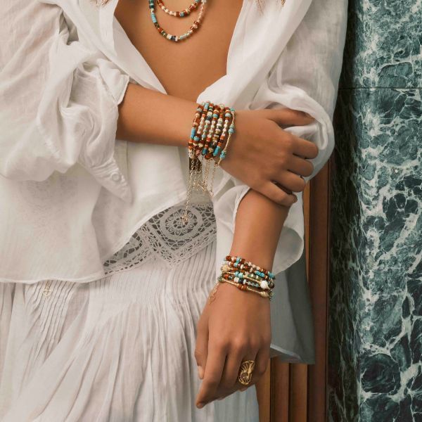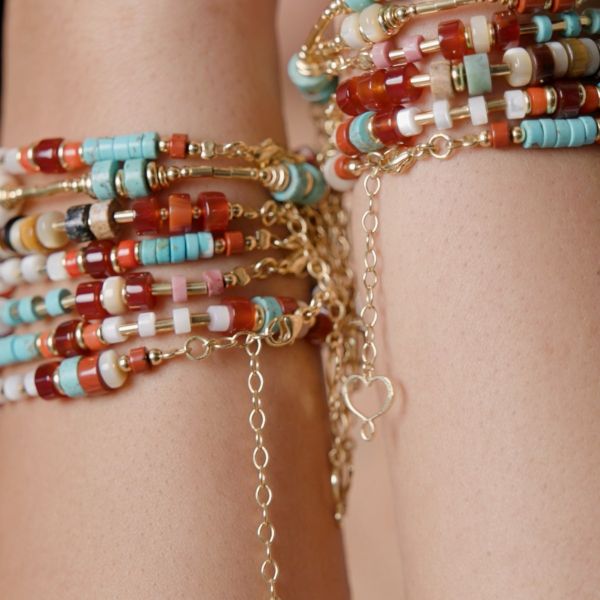 Bracciale in argento 925 con galvanica oro giallo ad alto spessore e ad alta resistenza. Il bracciale è ricoperto per tutta la sua superficie da pietre di paesina, diaspro rosso, occhio di tigre, bronzite, agata rossa, turchese africano e madreperla brown alternate ad elementi decorativi in argento.