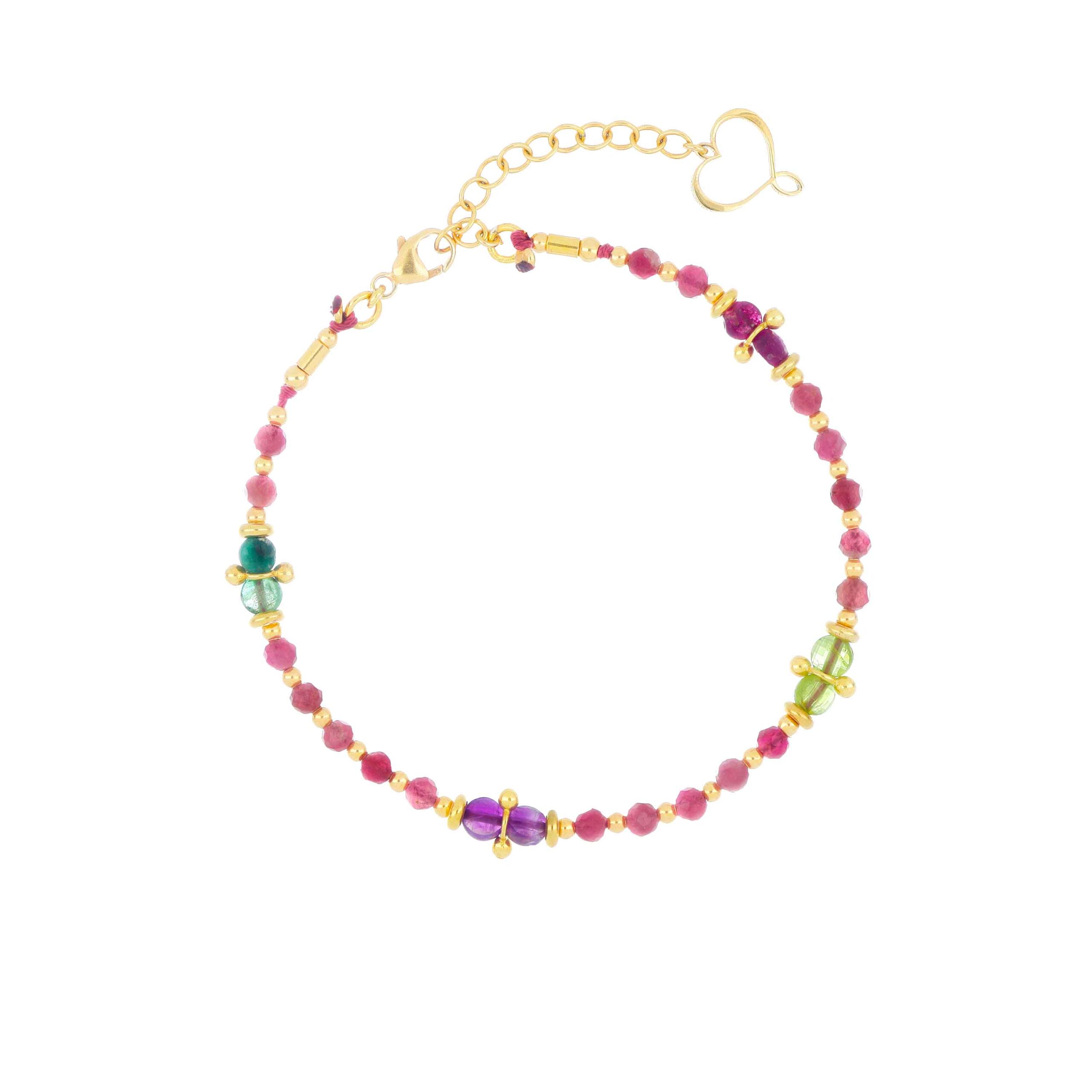 Bracciale in argento 925 con galvanica oro giallo ad alto spessore e ad alta resistenza. Il bracciale è composto da pietre di tormalina, peridoto, smeraldo, rubino e ametista alternate ad elementi decorativi in argento.