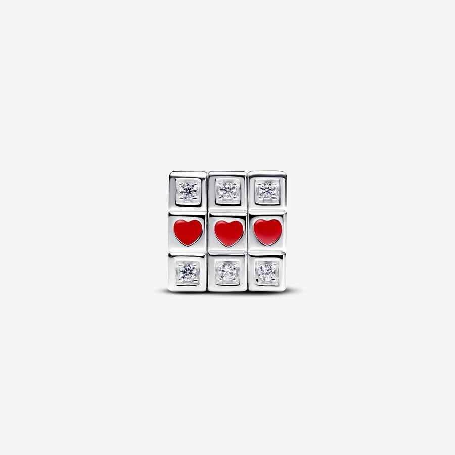 Un divertente simbolo di amore. Questo charm rappresenta un giocattolo a forma di cubo, formato da cubi più piccoli decorati da cuori dipinti in smalto rosso, pietre luminose e lettere incise. I cubi si muovono e ti permettono di creare tante combinazioni di lettere e disegni spostandoli in diverse direzioni.