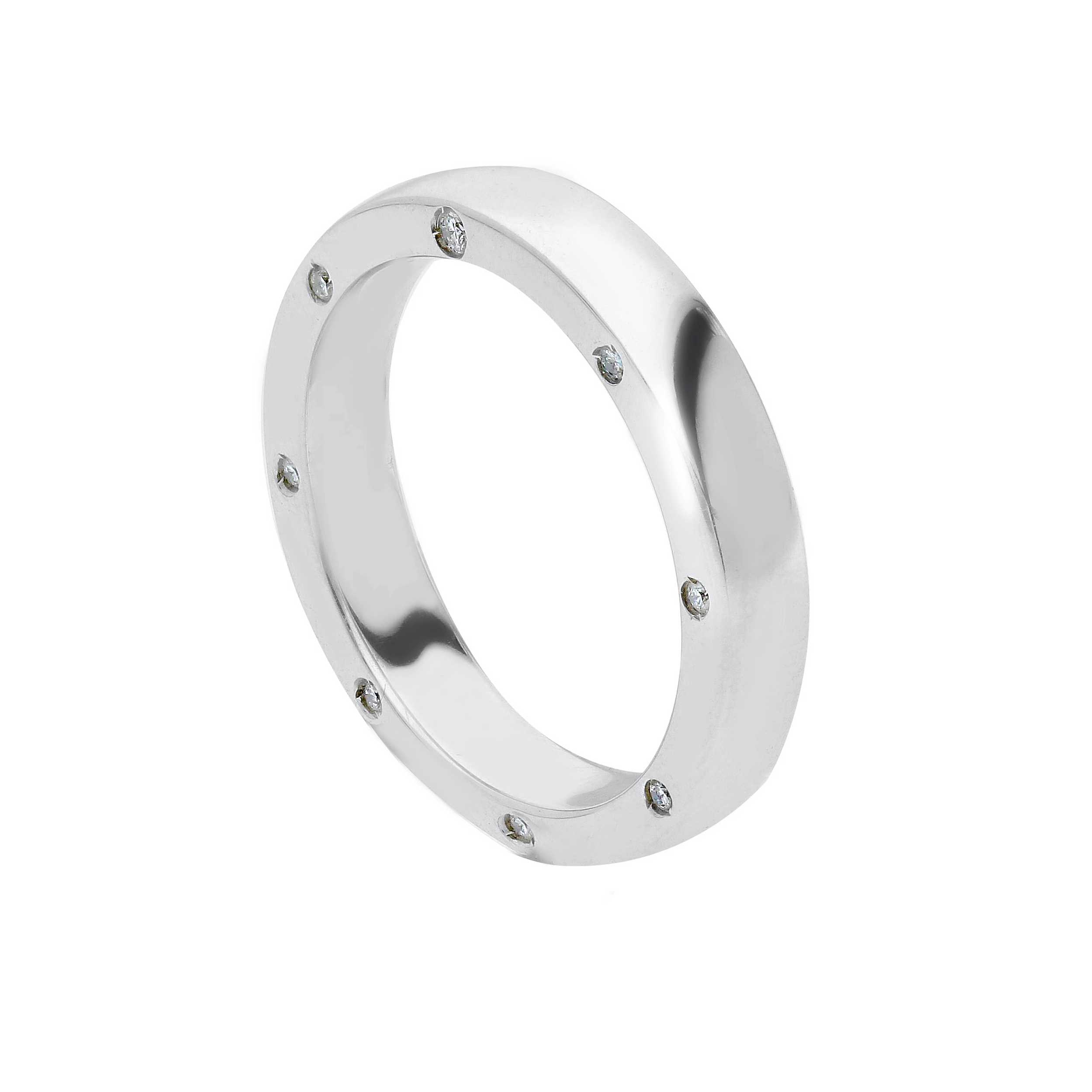 Diamanti incastonati lateralmente per un totale di 0,04 ct aggiungono una luminosità elegante e preziosa, impreziosendo la fede con un dettaglio raffinato che cattura la luce senza comprometterne l’equilibrio estetico.