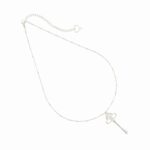 Presenta una chiave pendente con decorazione di cuori maman intrecciati e catena con sfere argentate.