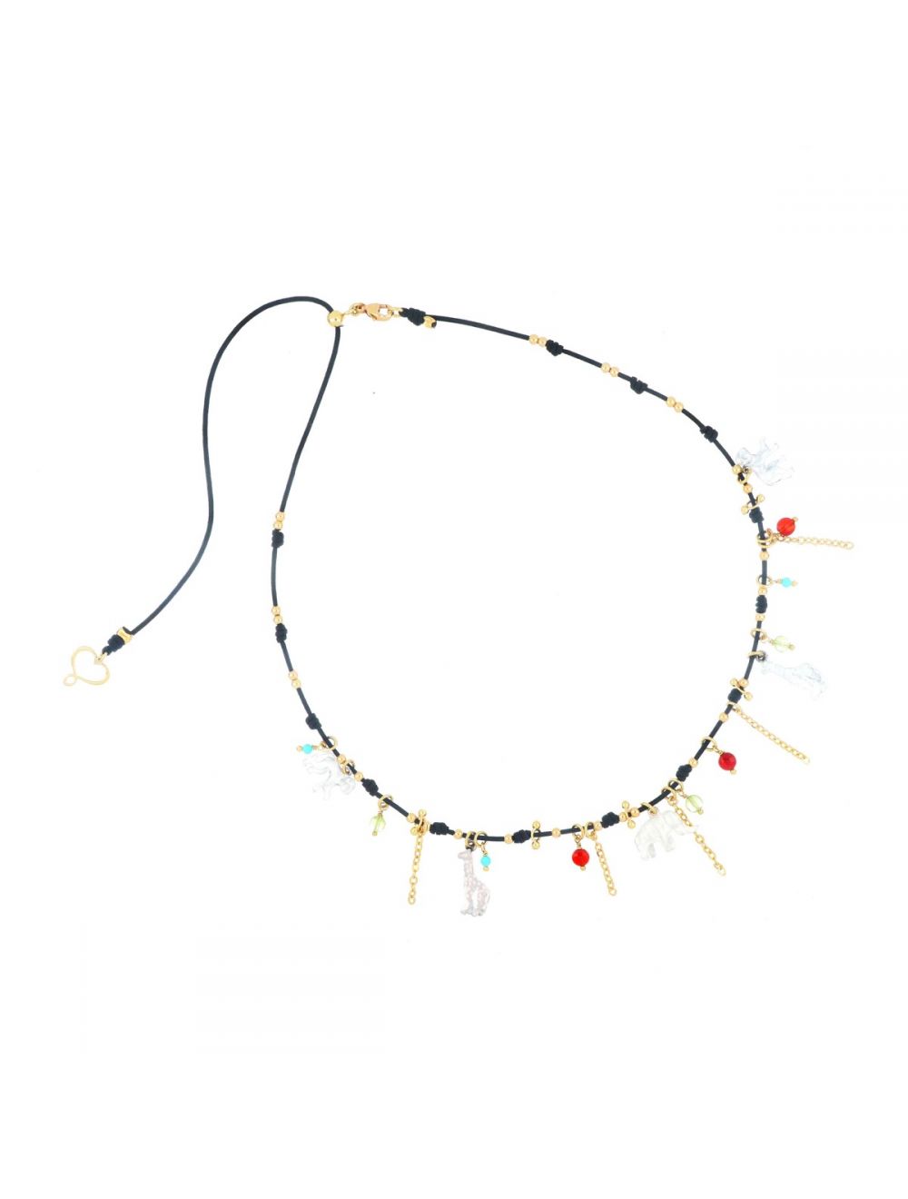 Girocollo di filo di nylon nero con elementi decorativi in argento 925 placcato in oro giallo ad alto spessore ed alta resistenza, pietre pendenti di corniola, peridoto e pasta di turchese e cinque soggetti animali smaltati in bianco.