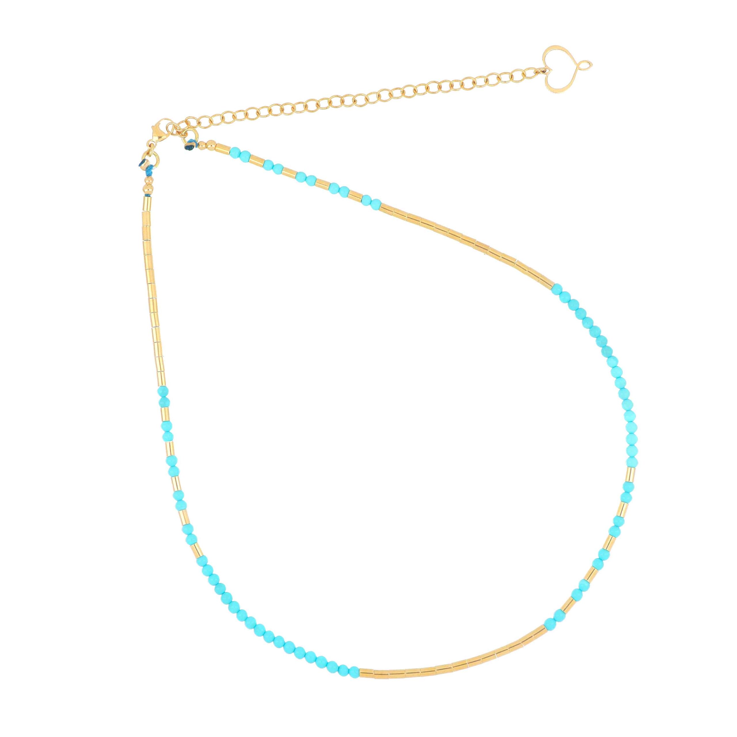 Girocollo in argento 925 con galvanica oro giallo ad alto spessore e ad alta resistenza. Il girocollo è composto da pasta di turchese alternata a tubini in argento galvanizzato oro giallo.