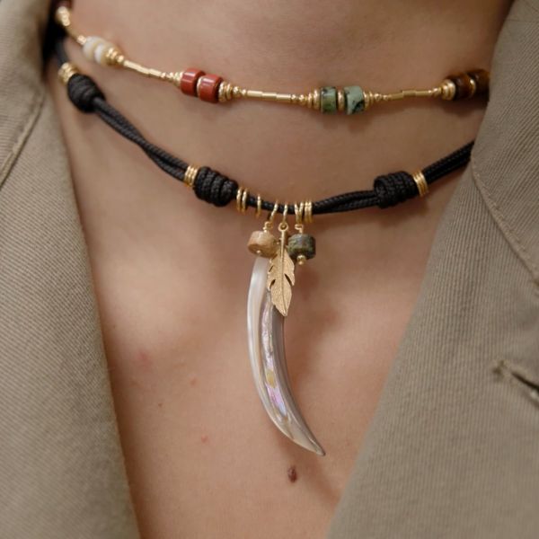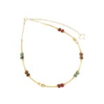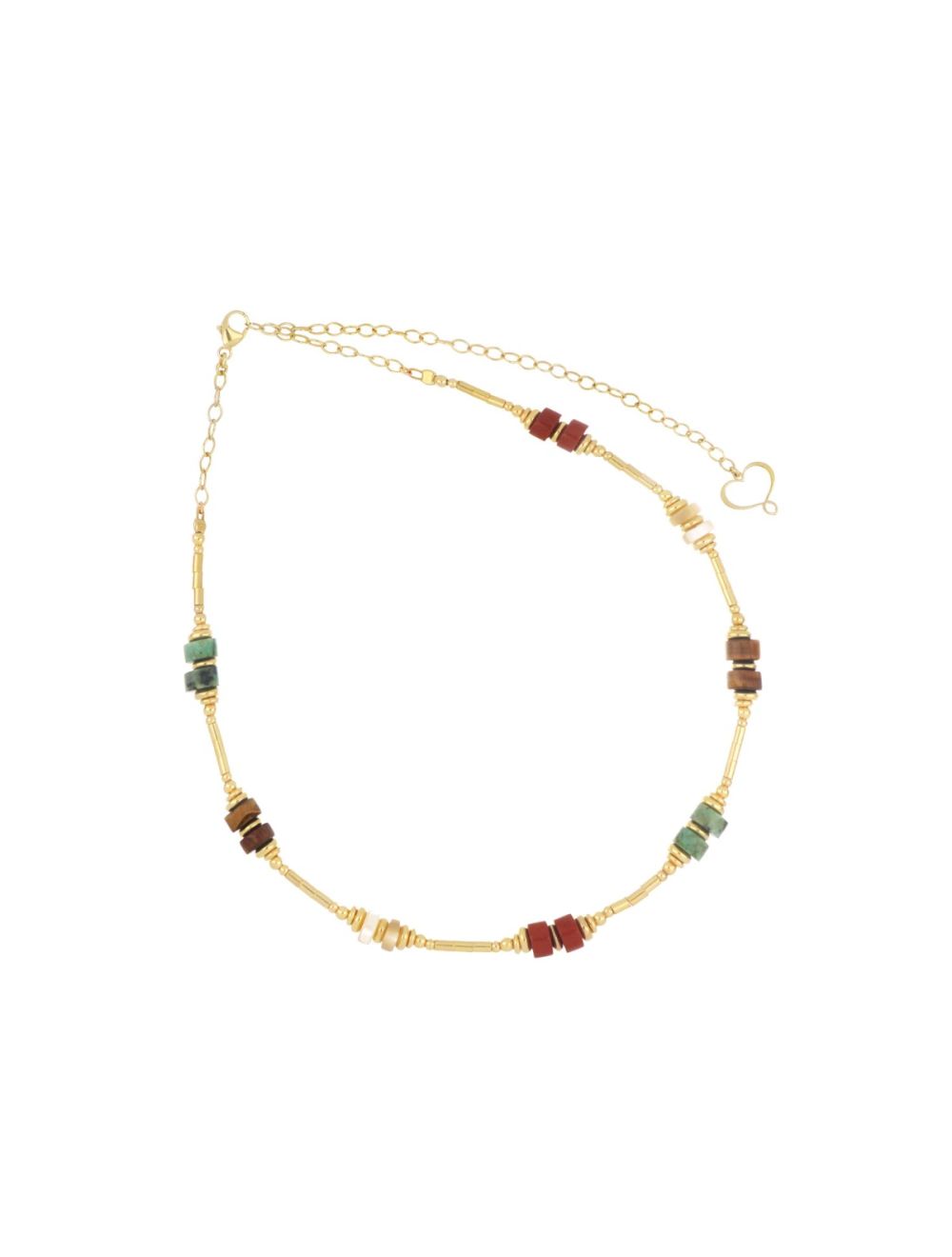 Girocollo in argento 925 con galvanica oro giallo ad alto spessore e ad alta resistenza. Il girocollo presenta pietre di diaspro rosso, occhio di tigre, turchese africano, madreperla brown alternate ad elementi decorativi e tubini in argento.