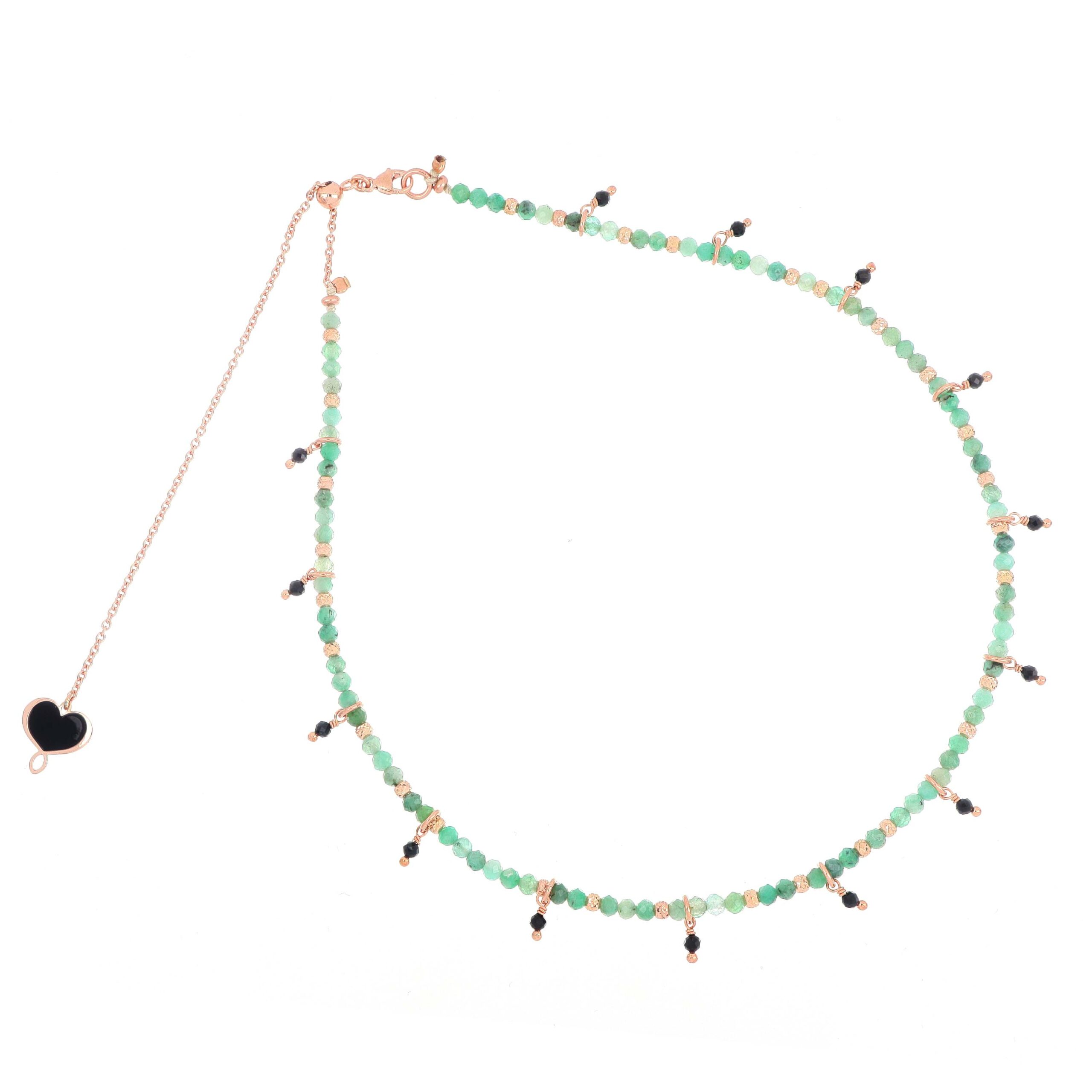 Girocollo realizzato in argento 925 con galvanica oro rosa ad alto spessore e resistenza. Il bracciale presenta pietre di Smeraldo e gocce pendenti di Spinello.
