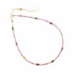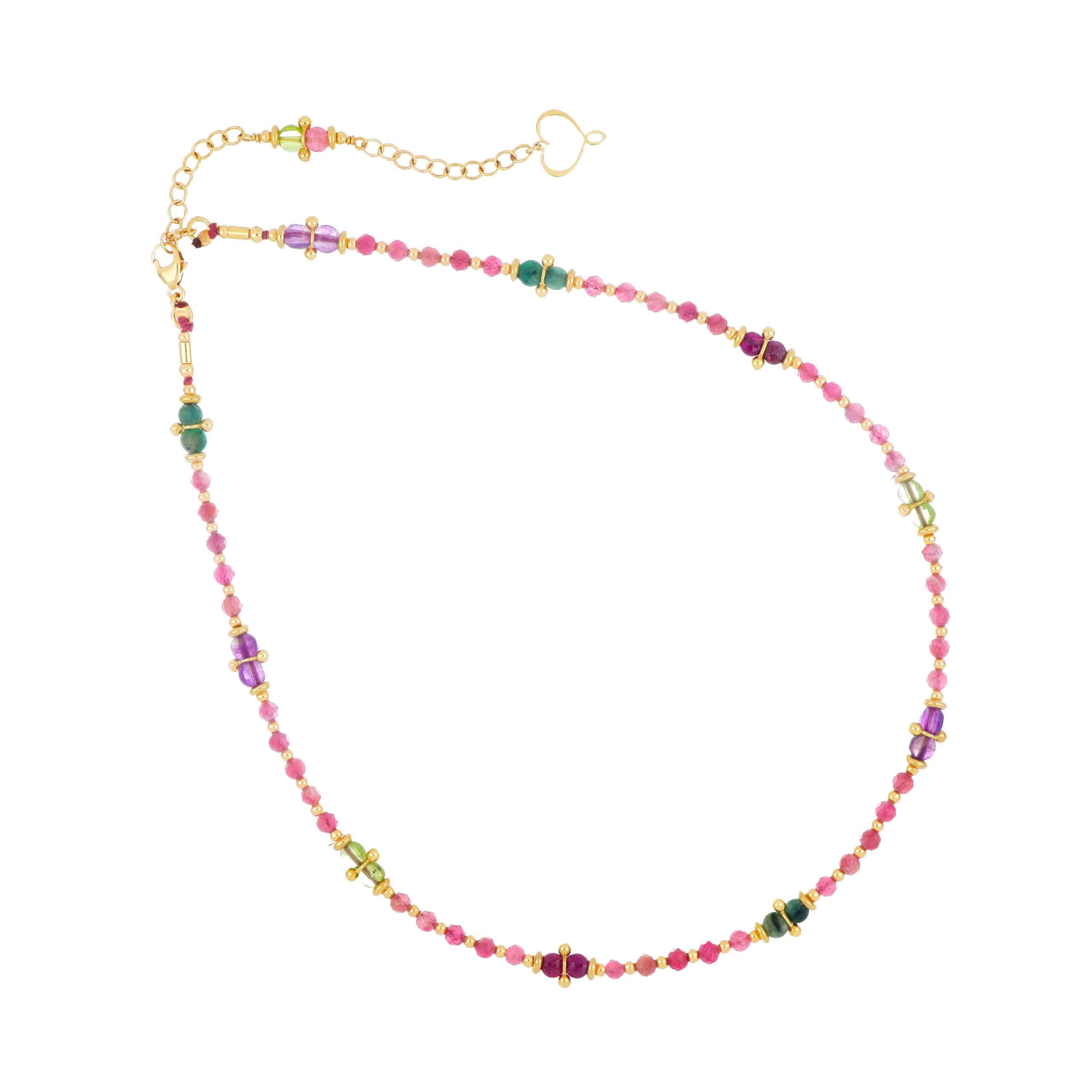 Girocollo in argento 925 con galvanica oro giallo ad alto spessore e ad alta resistenza. Il girocollo è composto da pietre di tormalina rosa, peridoto, smeraldo, rubino e ametista alternate ad elementi decorativi in argento.