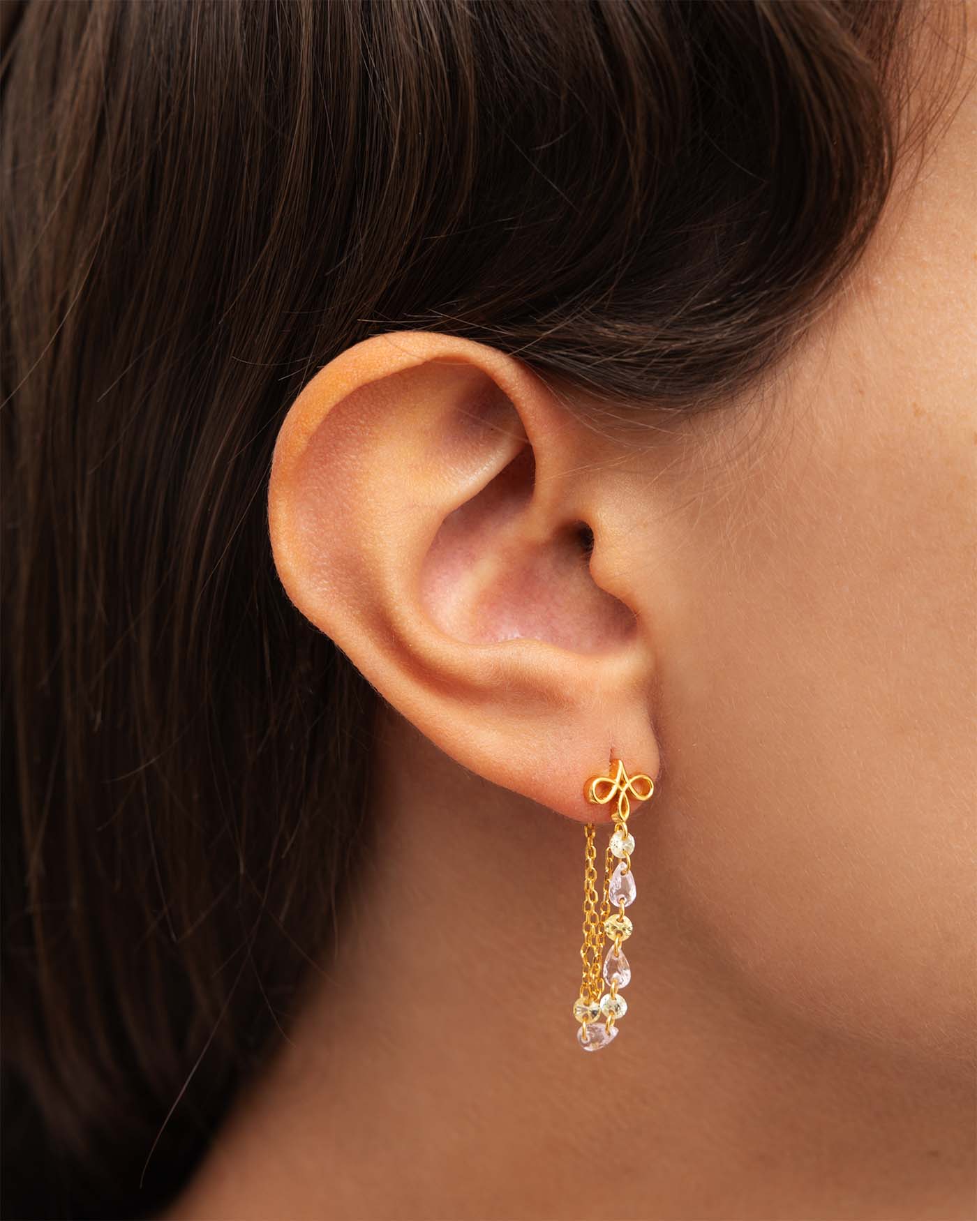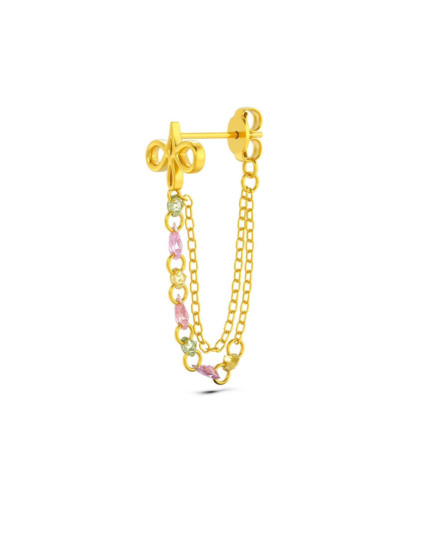 Il suo design si sviluppa su due catene pendenti di diversa lunghezza, unite a una chiusura a farfallina con il nostro logo. La catena più lunga è arricchita da pietre in zirconia cubica pastello montate senza incastonatura, per riflessi più vivi e naturali. La catena più corta, invece, resta essenziale: un elemento di equilibrio visivo che valorizza la simmetria del volto senza risultare banale. Così leggero, così d’impatto perché unisce la dolcezza delle nuance pastello all’energia urban delle catene. Il risultato? Un ear look dinamico pensato per accompagnarti dal giorno alla sera. Il gioiello perfetto per chi ama mixare mondi diversi in un’unica scelta.