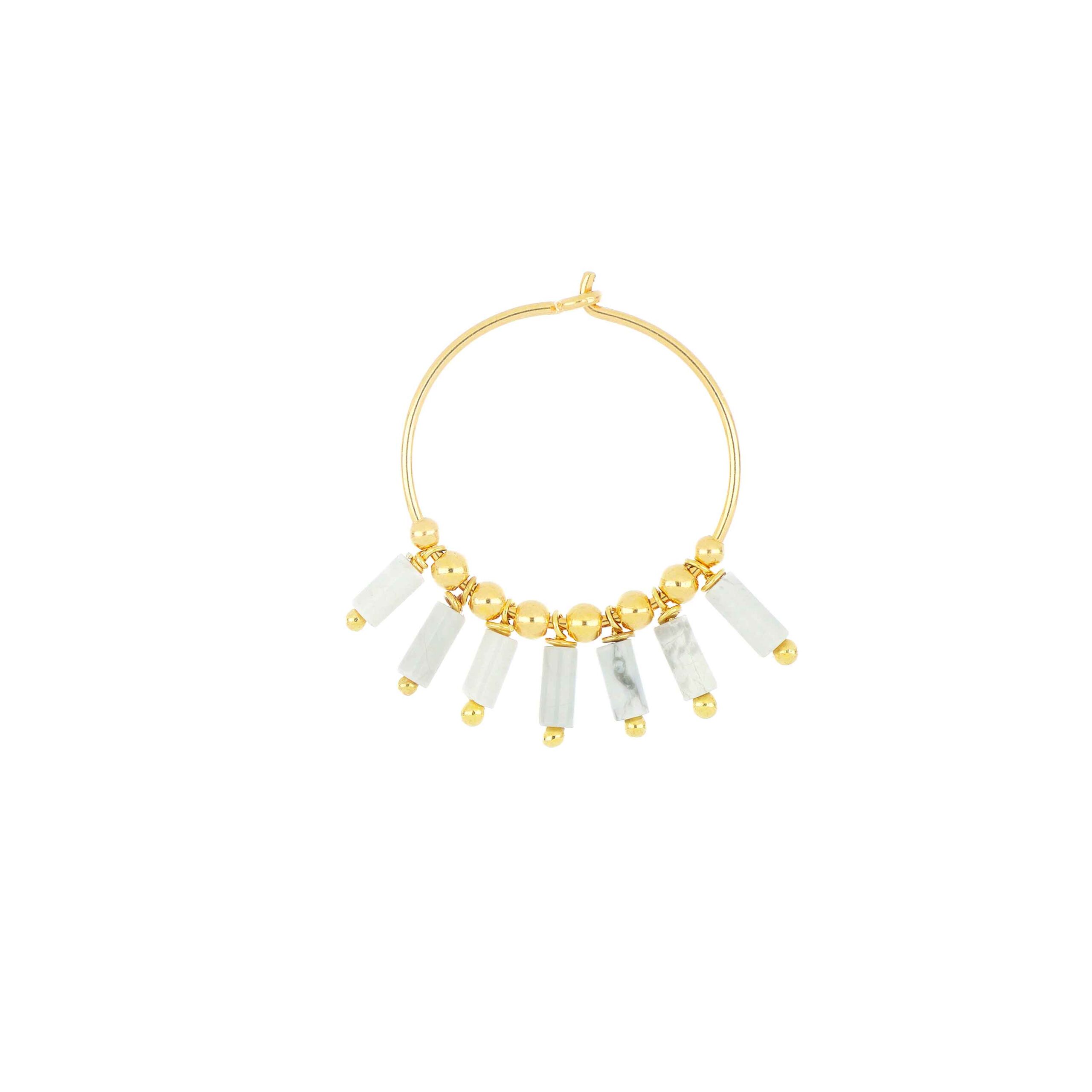 Orecchino a cerchio singolo con sette pendenti di pietre di agata bianca e sfere decorative in argento.