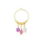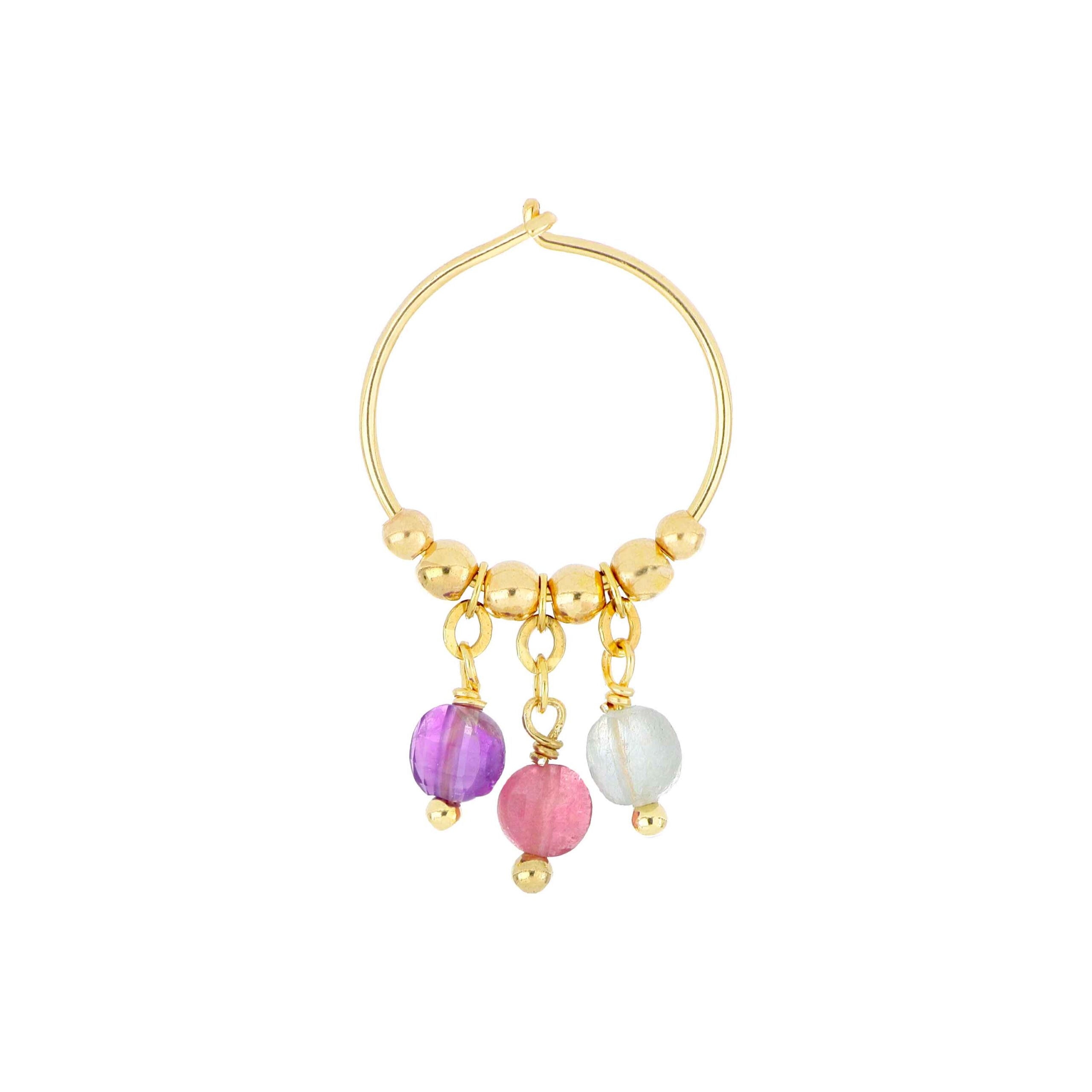 Orecchino a cerchio singolo con tre pietre pendenti di acquamarina, ametista, tormalina rosa e sfere decorative.