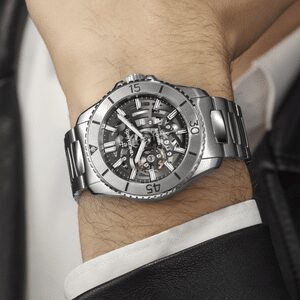 Ultraleggero è l’orologio più innovativo della serie Nereide e si ispira all’Uomo Vitruviano, simbolo del Rinascimento e della fine della contrapposizione tra arte e scienza. La singolare geometria del quadrante scheletrato si integra perfettamente con il corpo del movimento, attraverso un’originale soluzione costruttiva brevettata che consente maggior leggerezza e minore ingombro.